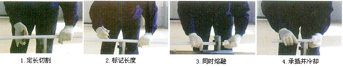 4、同時熔融PE管材、管件,然后承插(承插到位后待片刻松手,在加熱、承插、冷卻過程中禁止扭動)。