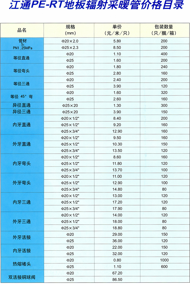| 江通PE-RT地板輻 射采暖管價格目錄 |